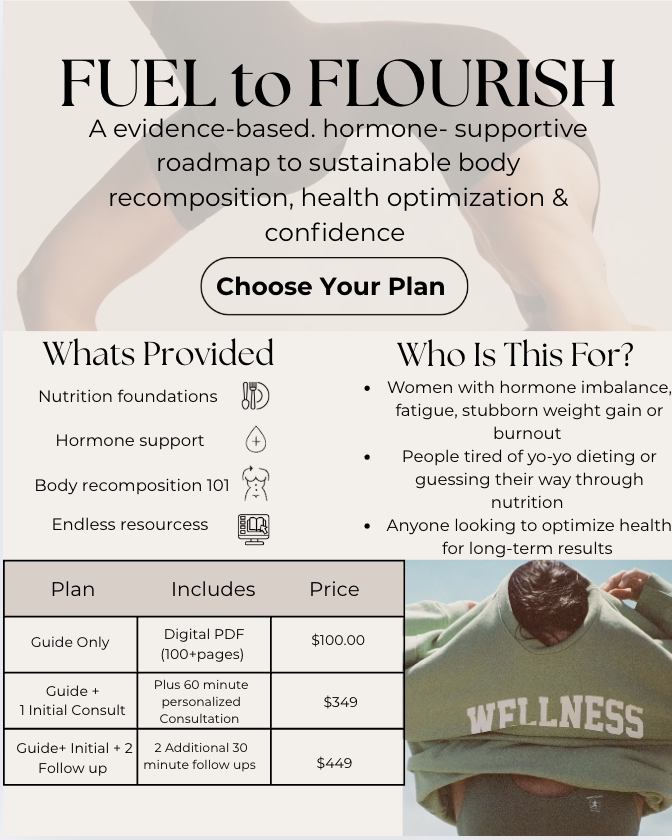 Fuel to Flourish is evidence-based and focused on long-term health. It emphasizes sustainable habits, hormone optimization, and body recomposition rather than quick fixes.